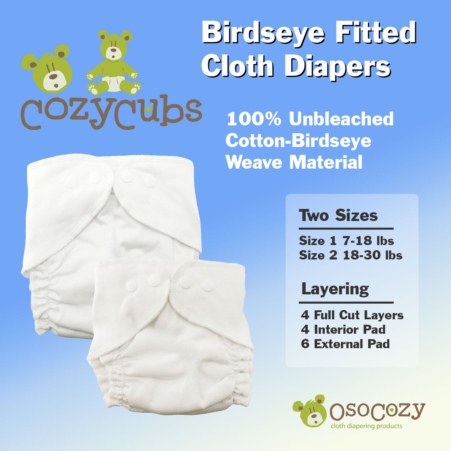 The Cozy Cubs Birdseye Fitted Diaper is a dependable, natural‑fiber fitted option designed for retailers seeking a versatile, easy‑to‑sell cloth diapering staple. Made from 100% birdseye cotton, these fitteds offer fast absorption, a trim profile, and a comfortable fit for everyday use. With a two‑size system, durable snaps, and soft elastics, they provide a straightforward solution for customers looking for a breathable, diaper cover‑ready diapering option.